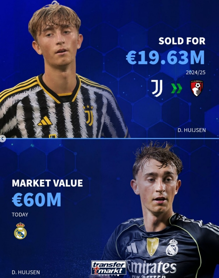 24/25赛季尤文1963万欧出售至伯恩茅斯,现身价6000万欧